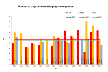 We can also look at how many days there are between when each chick fledges and when it migrates. Some of these chicks have only been flying for around a month before they make the 3000+ mile journey south.